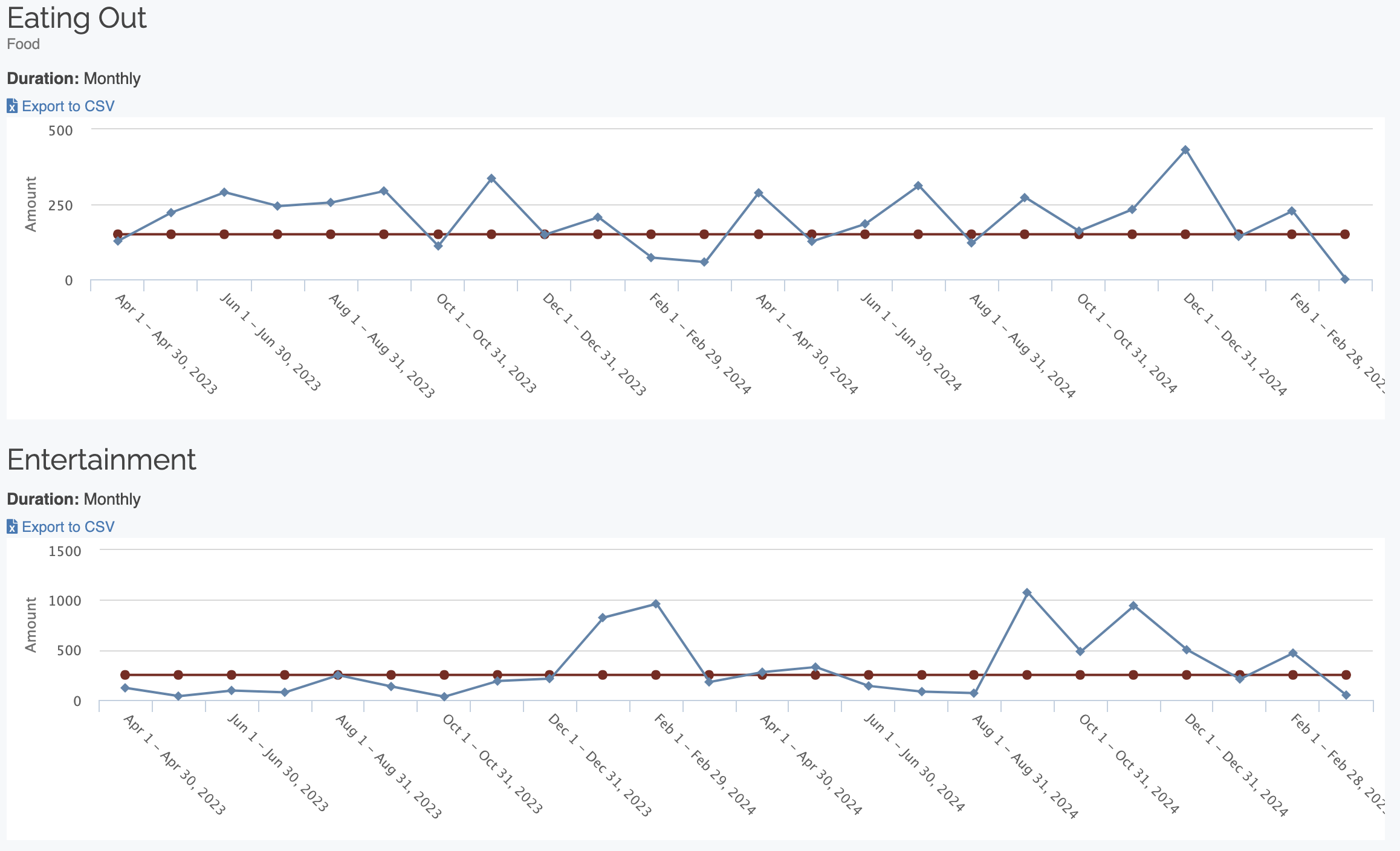 | Spending Reports View all of your spending and saving data in several report formats including line, bar, pie and text reports. |