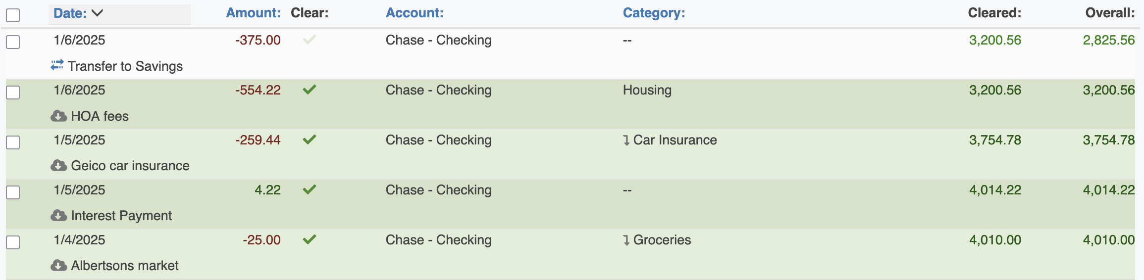 After transactions are downloaded to your account, they appear with a cloud icon next to the description in the Transaction Register. This icon helps differentiate synced transactions from those you manually entered.