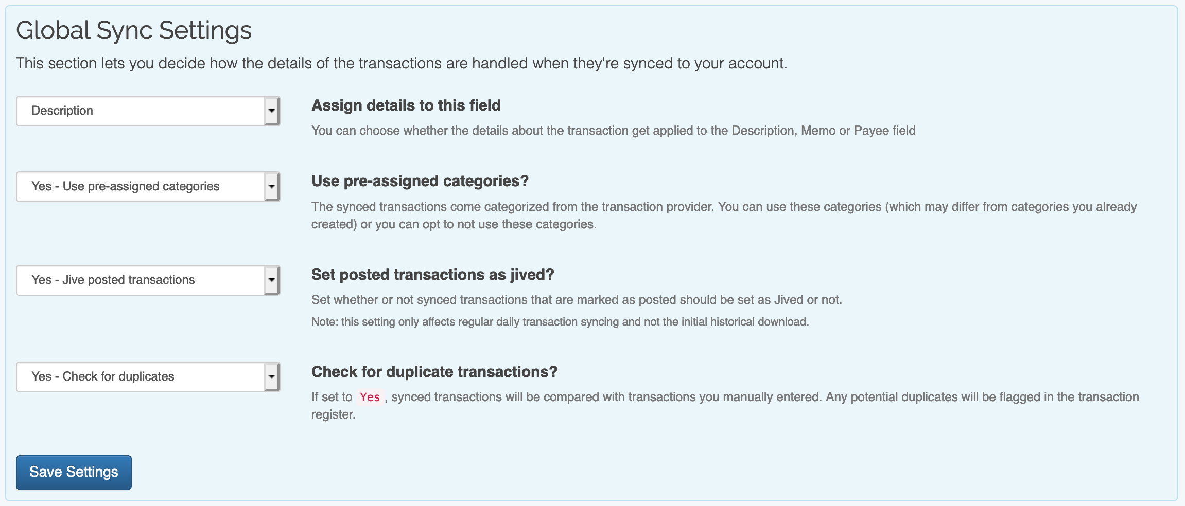 We want to make sure the syncing works exactly as you want it to. In an effort to make this happen, we built some global sync settings that you can adjust to change the behavior of the transaction syncing.