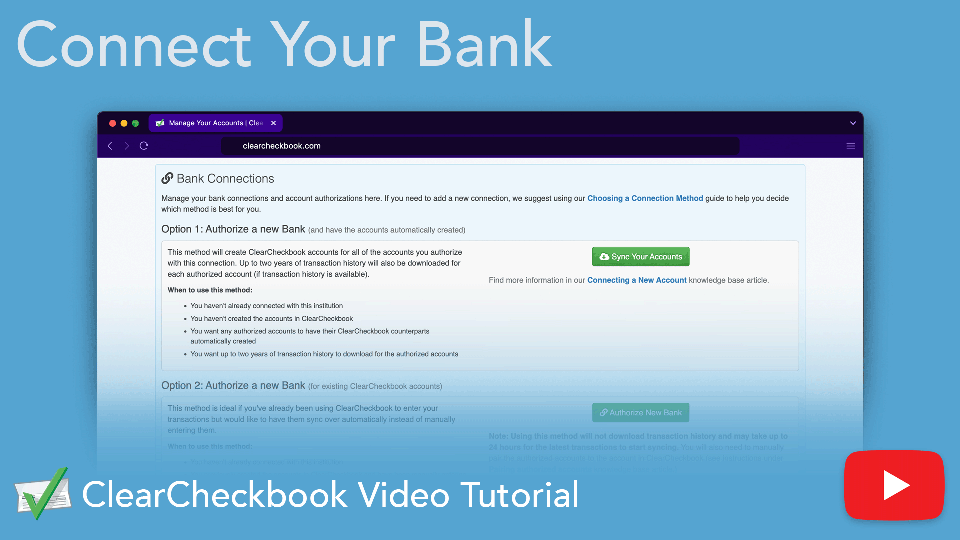 | Connect Your Bank to ClearCheckbook Connect your bank and have your transactions downloaded automatically. |