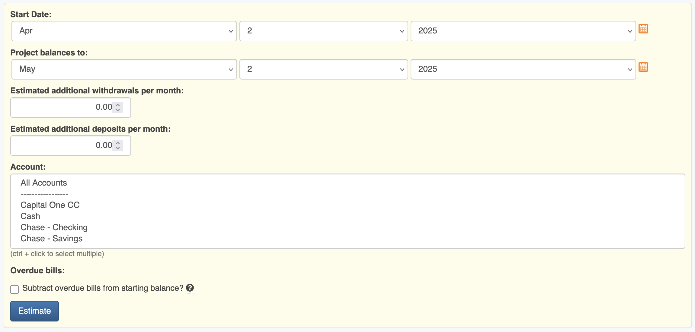 The Estimate Future Balances form gives you the options to set the start and end date you'd like to project your balances to. You can optionally enter any additional monthly withdrawals or deposits that aren't accounted for in your bills or recurring transactions. If you want the projection to take place for a specific account, you can select that account too.