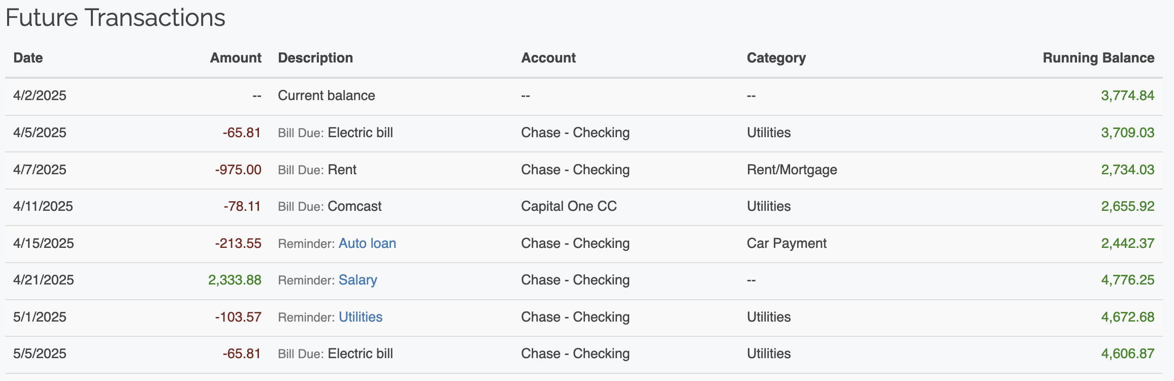The next block of information is a list of all the post-dated transactions, upcoming bills and recurring transactions that are adjusting your balance.