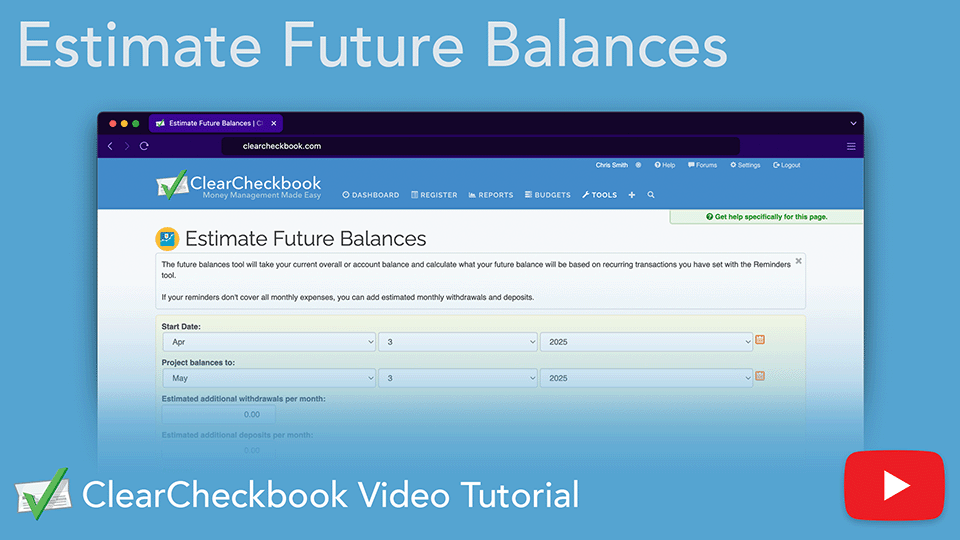 Estimating how much money you'll have in your account at a certain point in the future can be a great way to determine if you can afford to make a large purchase or pay off a debt. The Estimate Future Balances tool helps with this by taking your current account balance and then projecting them to a future date based on any recurring transactions and bills you have entered into the system.